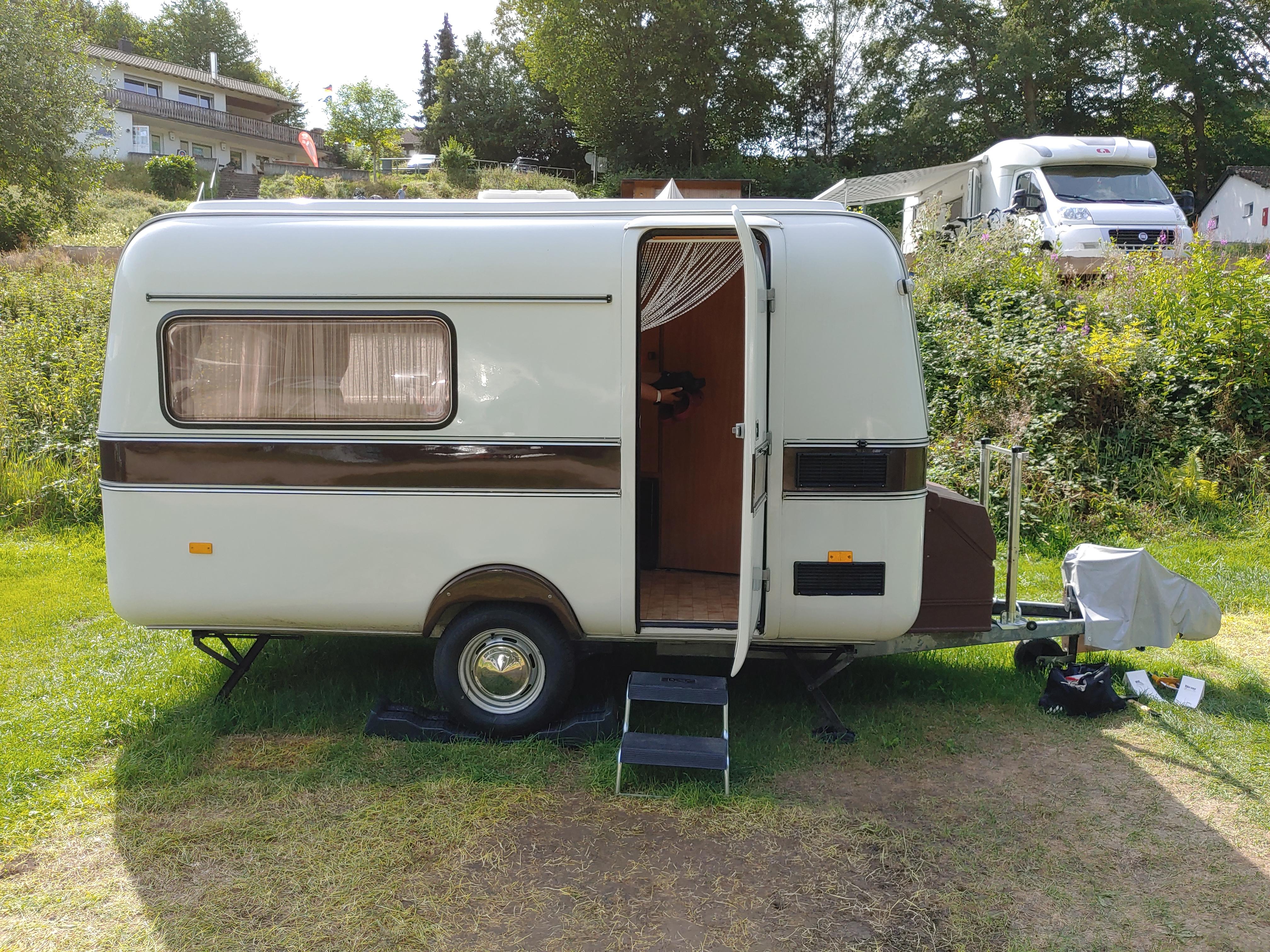 Nun ist er also unser. GFK-Aufbau, Waschraum, großes Bett und genügend Platz um sich im Wohnwagen umzuziehen.