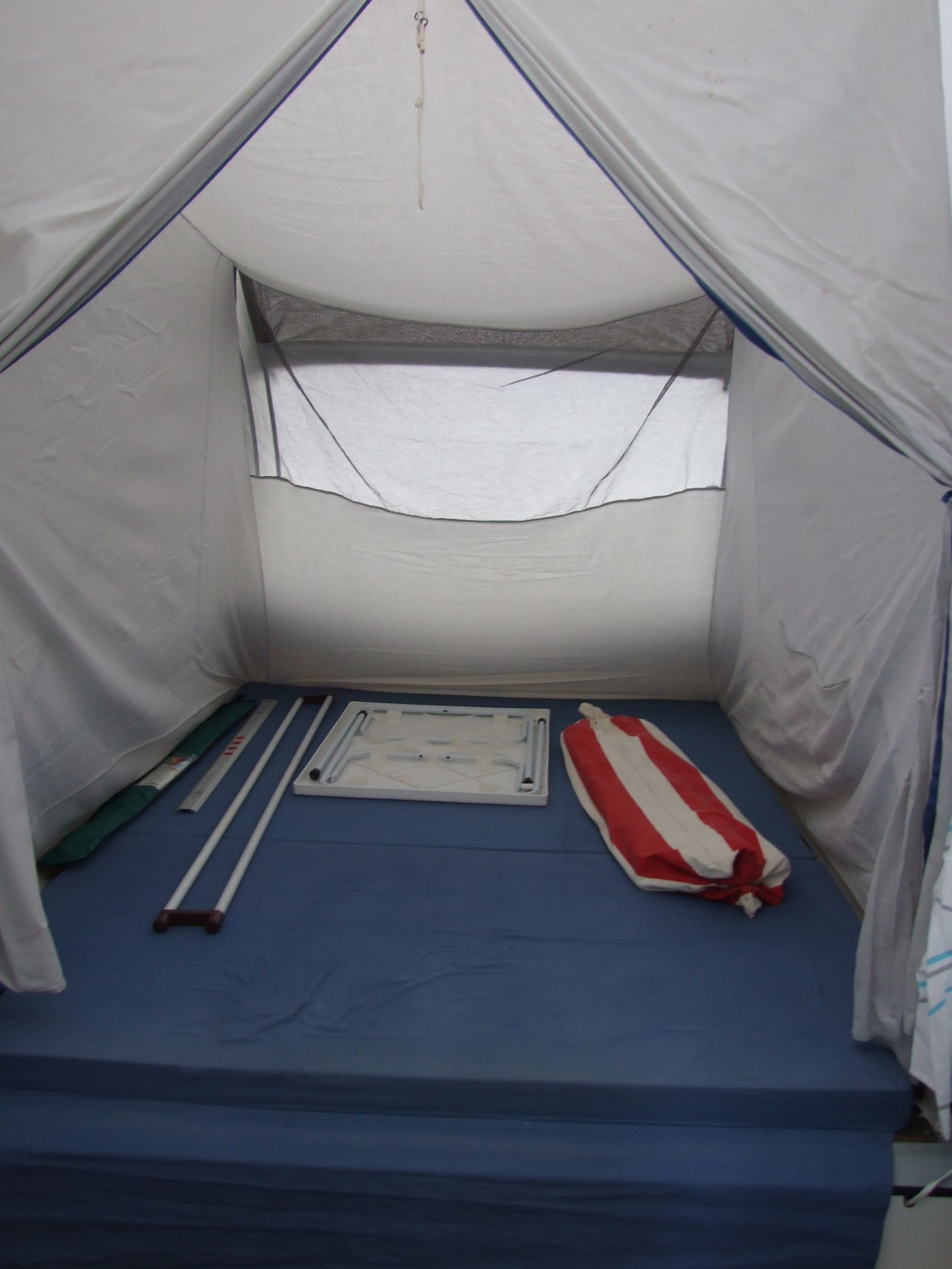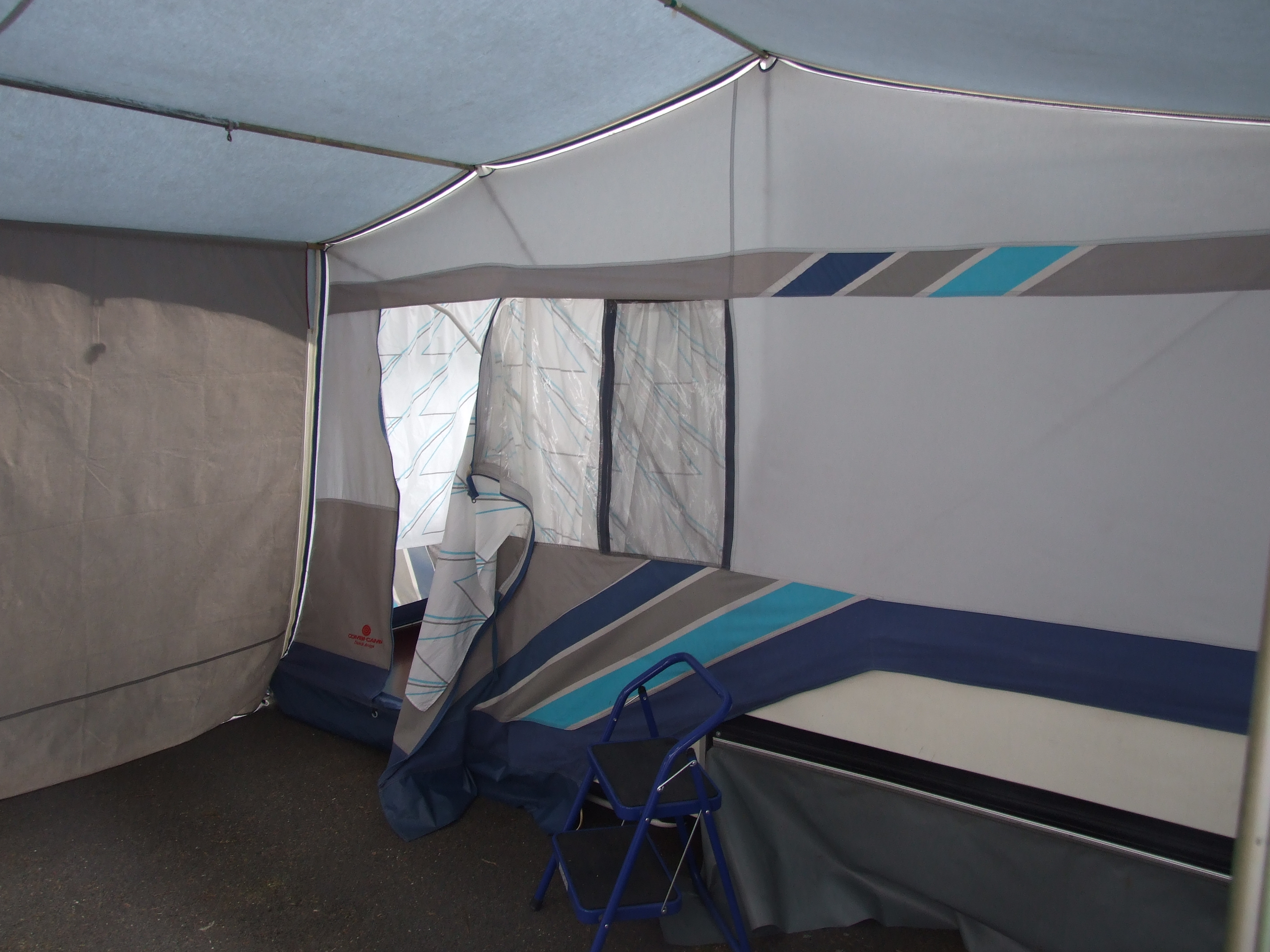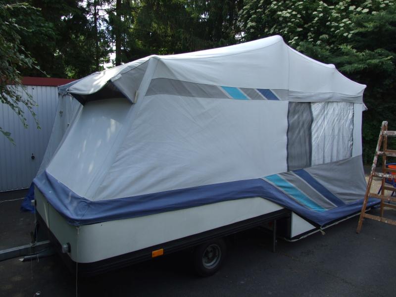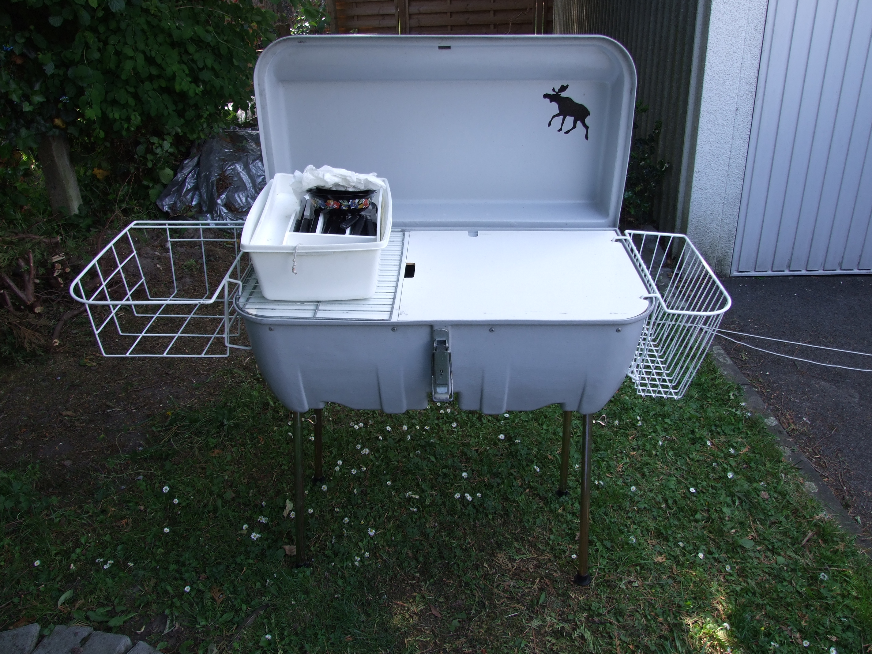 Ein feiner Wohnwagen, doch ohne festem Dach. Und da die Jahrestreffen vielfach von Regen begleitet waren, gab es immer das Problem, dass das Zelt nass eingepackt wurde und nach der Rückkehr ein Ort gesucht werden musste um den Wohnwagen zum Trocknen aufzuklappen.