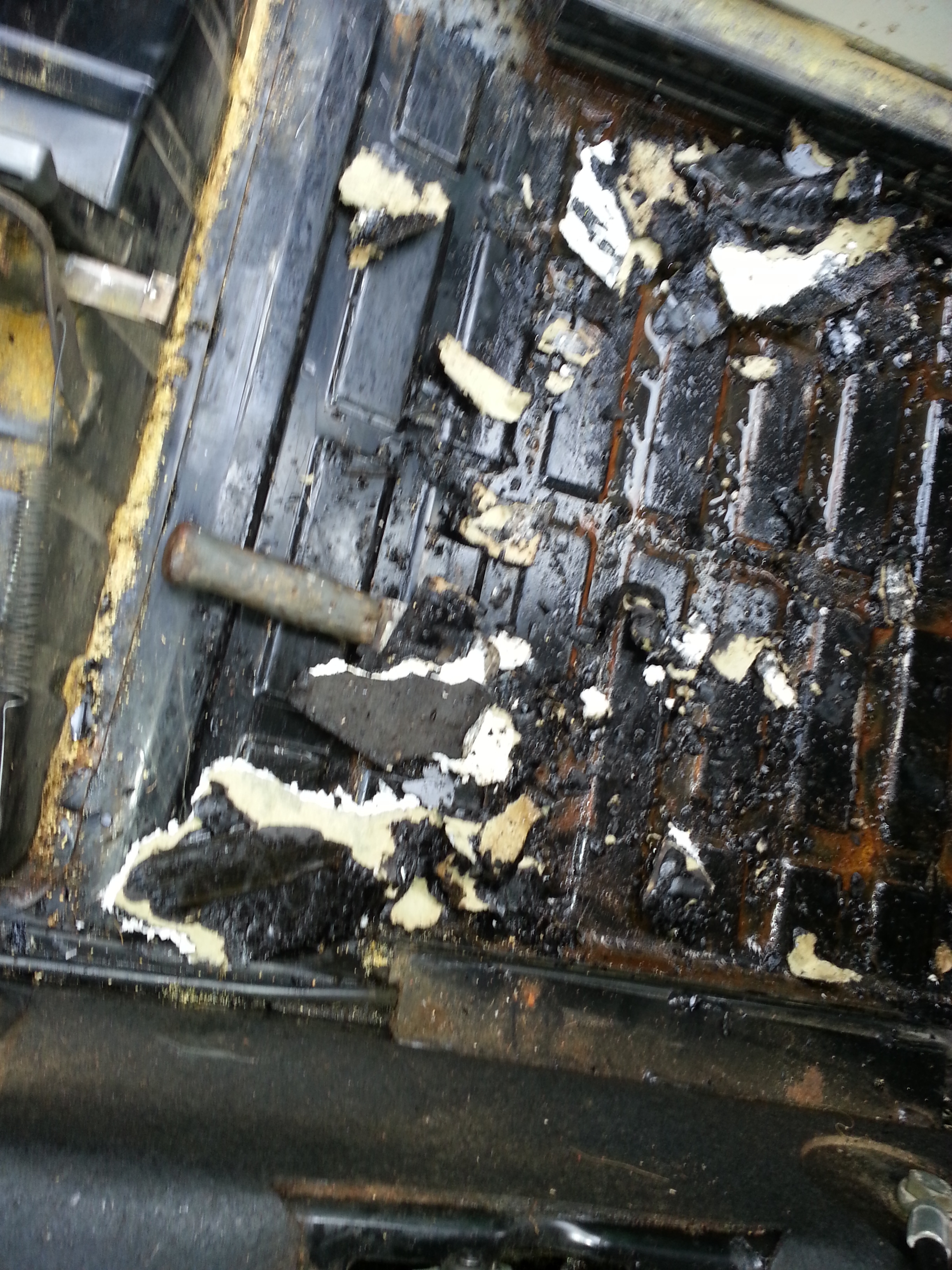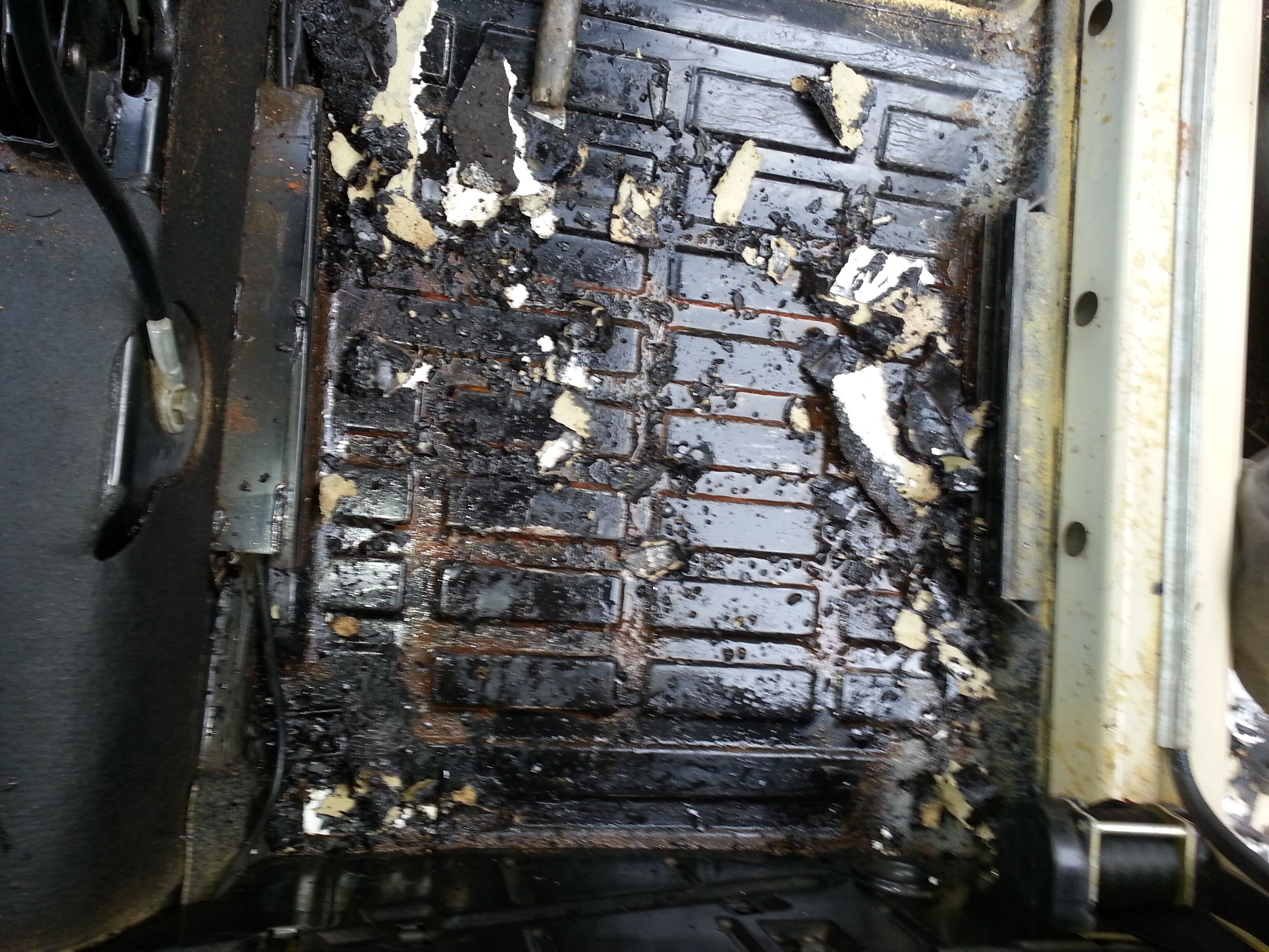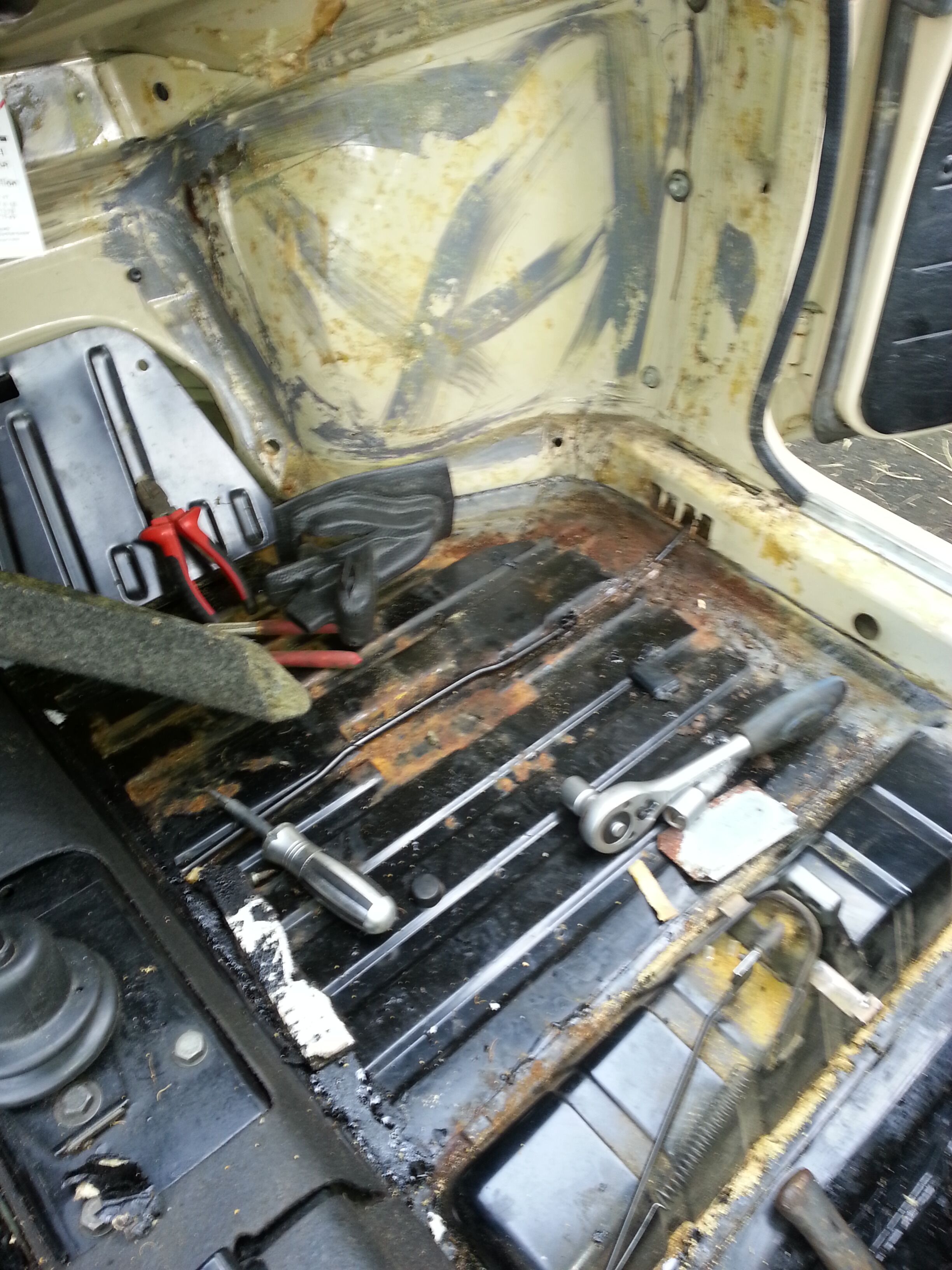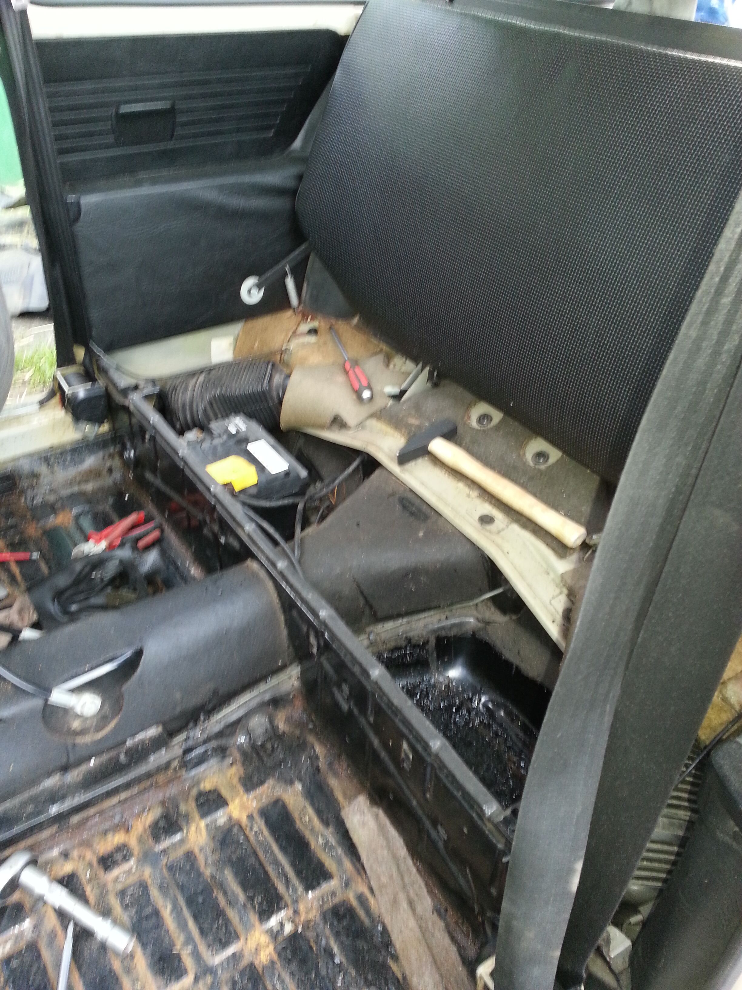 Tag 1: Sitze raus, Fußmatten raus, Gummimatten raus (dabei sind sie auf Grund des Alters in ihre Einzelteile zerfallen), Batterie raus, Wasser raus soweit es möglich war. "Und nun trocknen lassen" dachte ich mir, doch meine helfende Hand belehrte mich eines Besseren. Es gab einen kleinen Spachtel in die Hand und die Aufgabe mal eben noch die Teerpappen zu entfernen. Man, war ich am fluchen und ordentlich warm wurde mir auch dabei.