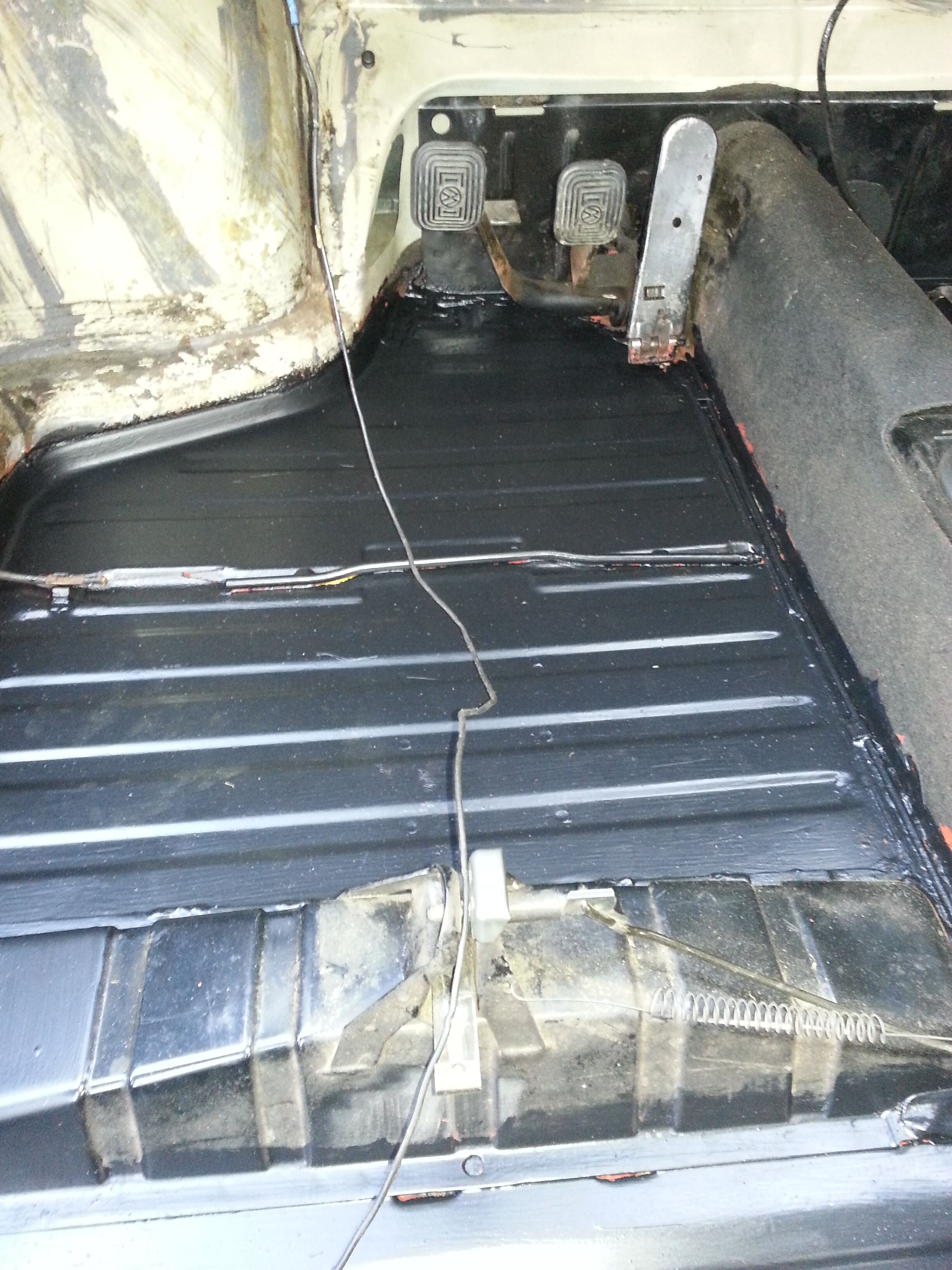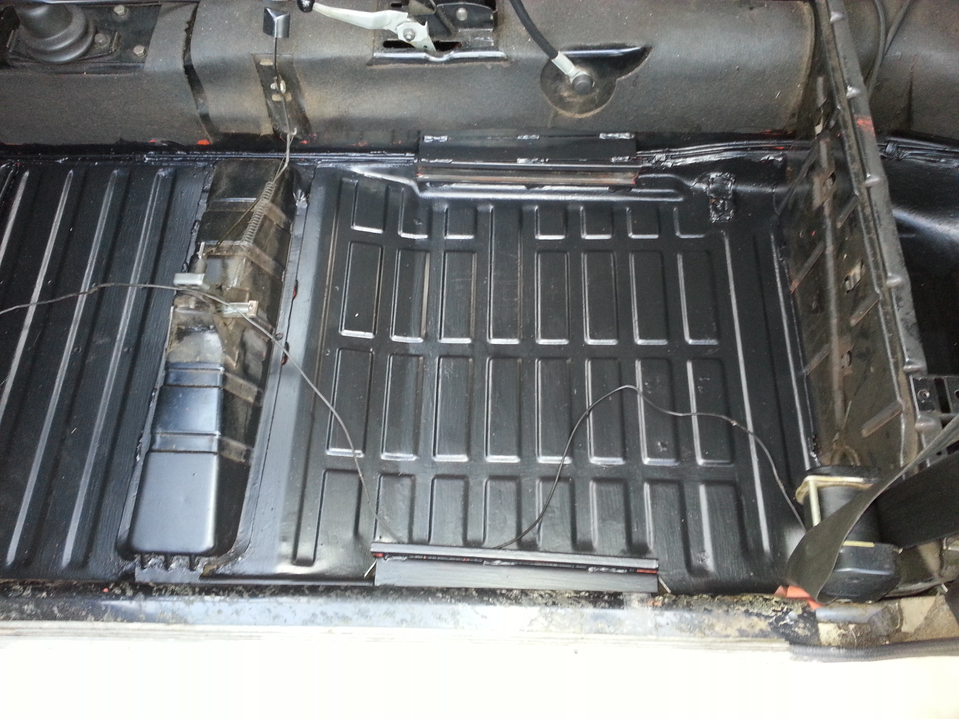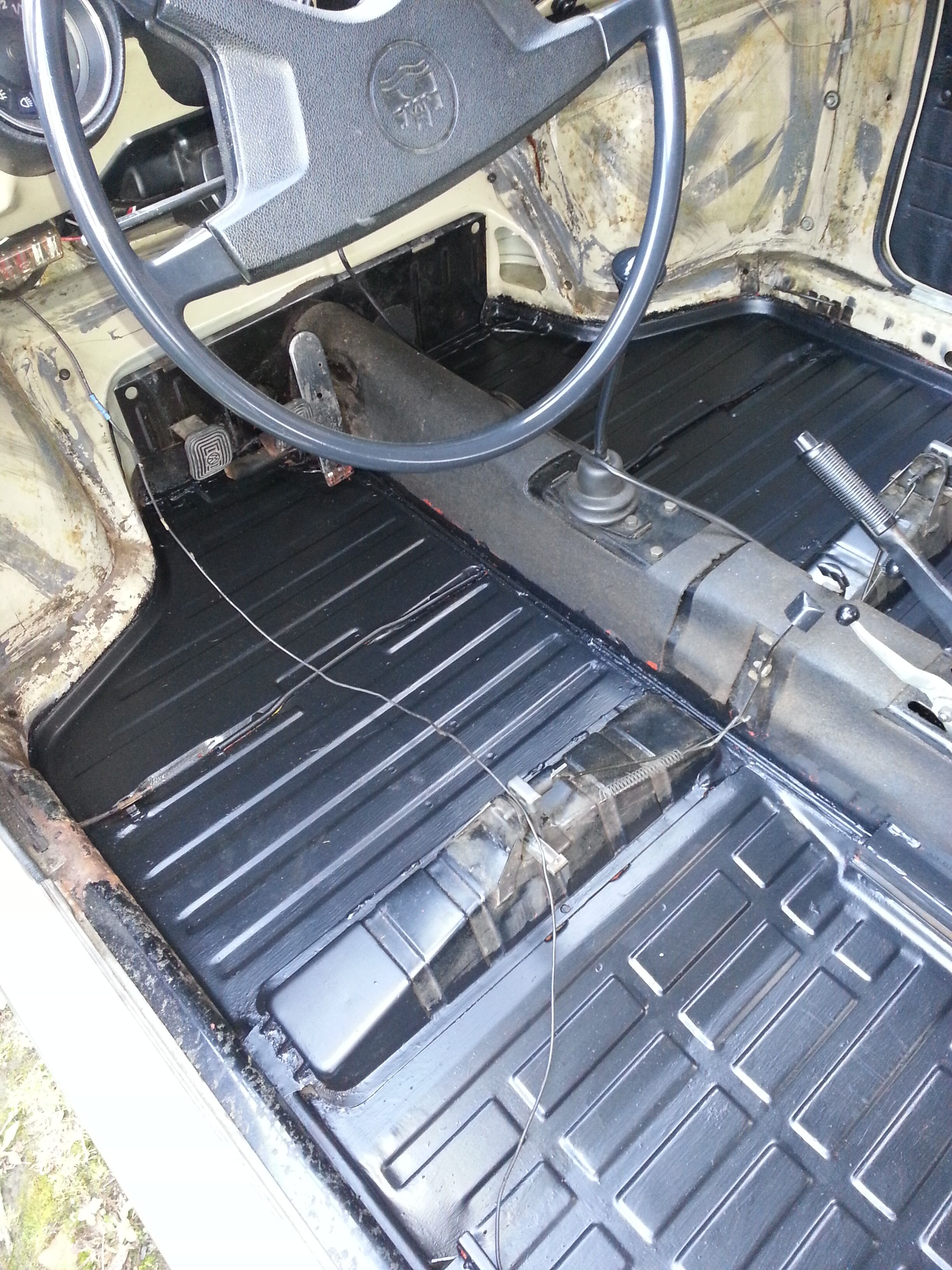 Tag 3: Endlich konnte der finale Anstrich erfolgen. Die Farbe, schwarz seidenmatt, sah wirklich geil aus. Wie frisch aus dem Werk. Einziger kleiner Nachteil, wenn der Teppich drüber liegt, sieht man nichts mehr von der Bodenplatte. ;-) Aber gut, man kann nicht alles haben. Nun folgte der weitere Zusammenbau. Da die ursprüngliche Gummimatte nicht mehr zu retten war, wurde erstmal ein alter, noch vorhandener Teppich verlegt. Mal sehen wie die endgültige Teppichfrage geklärt wird. Ich bin mir da noch unschlüssig. Dann bauten wir noch die Sitze ein und Dolf war wieder trocken und fahrbereit.