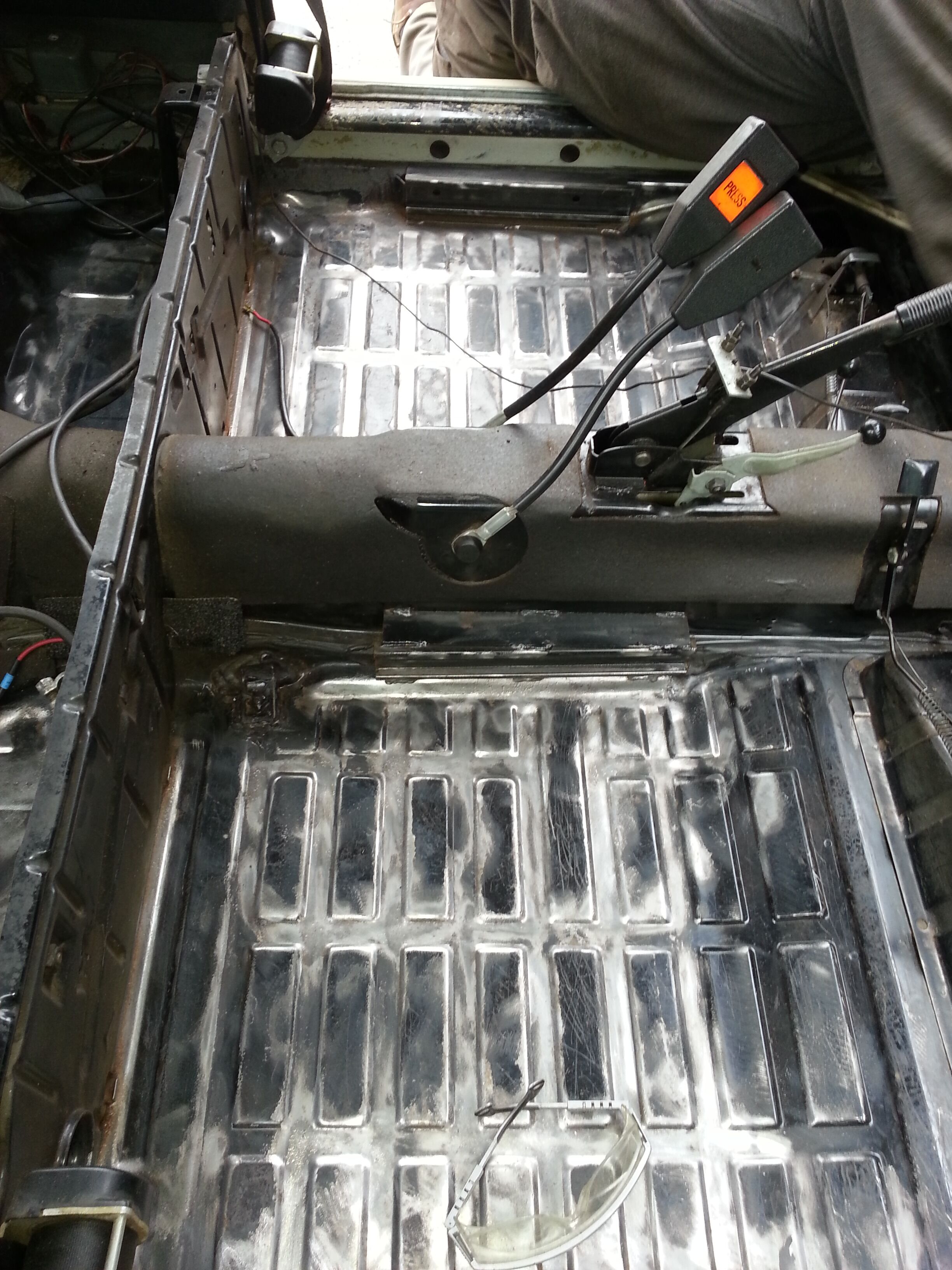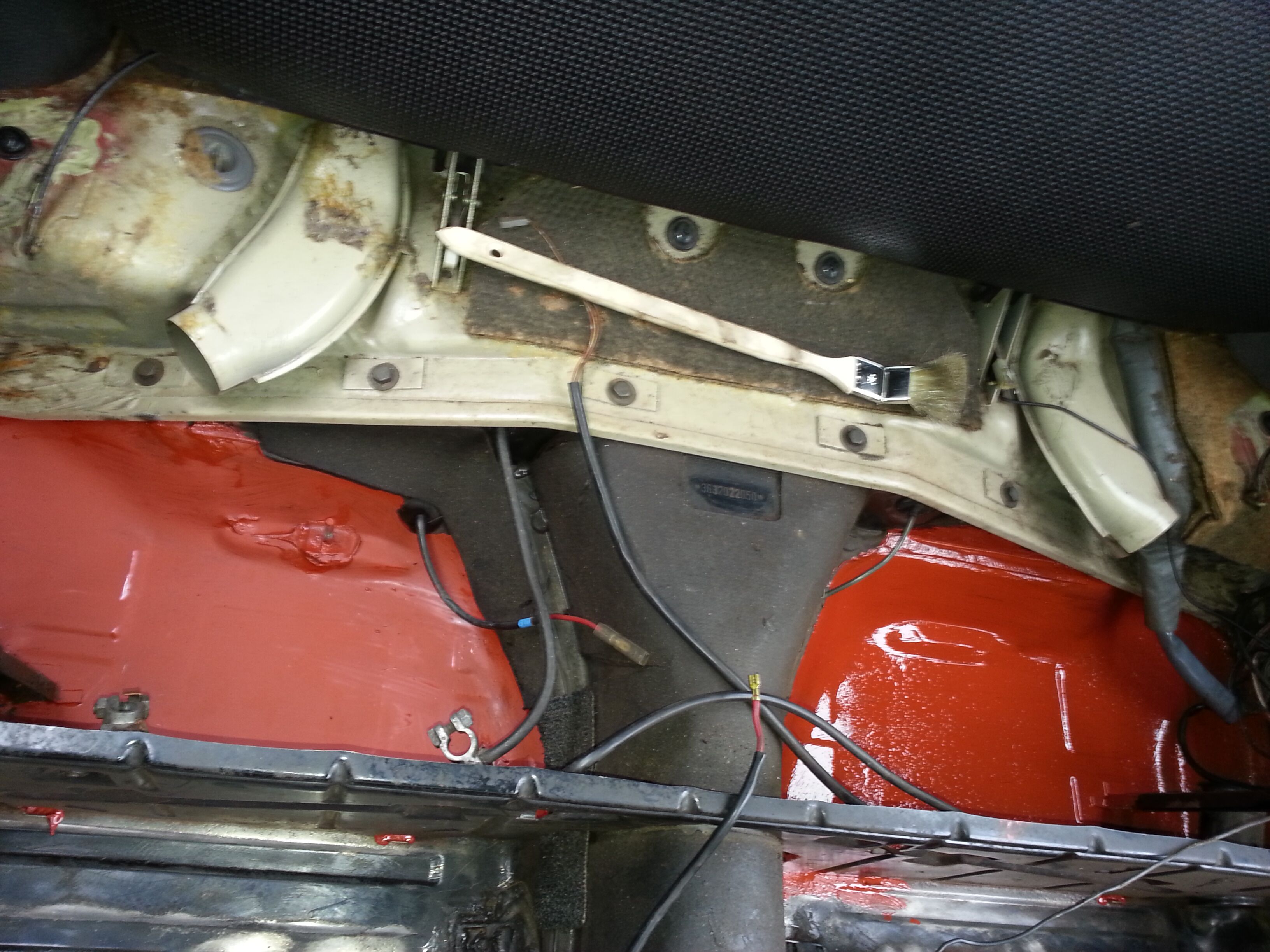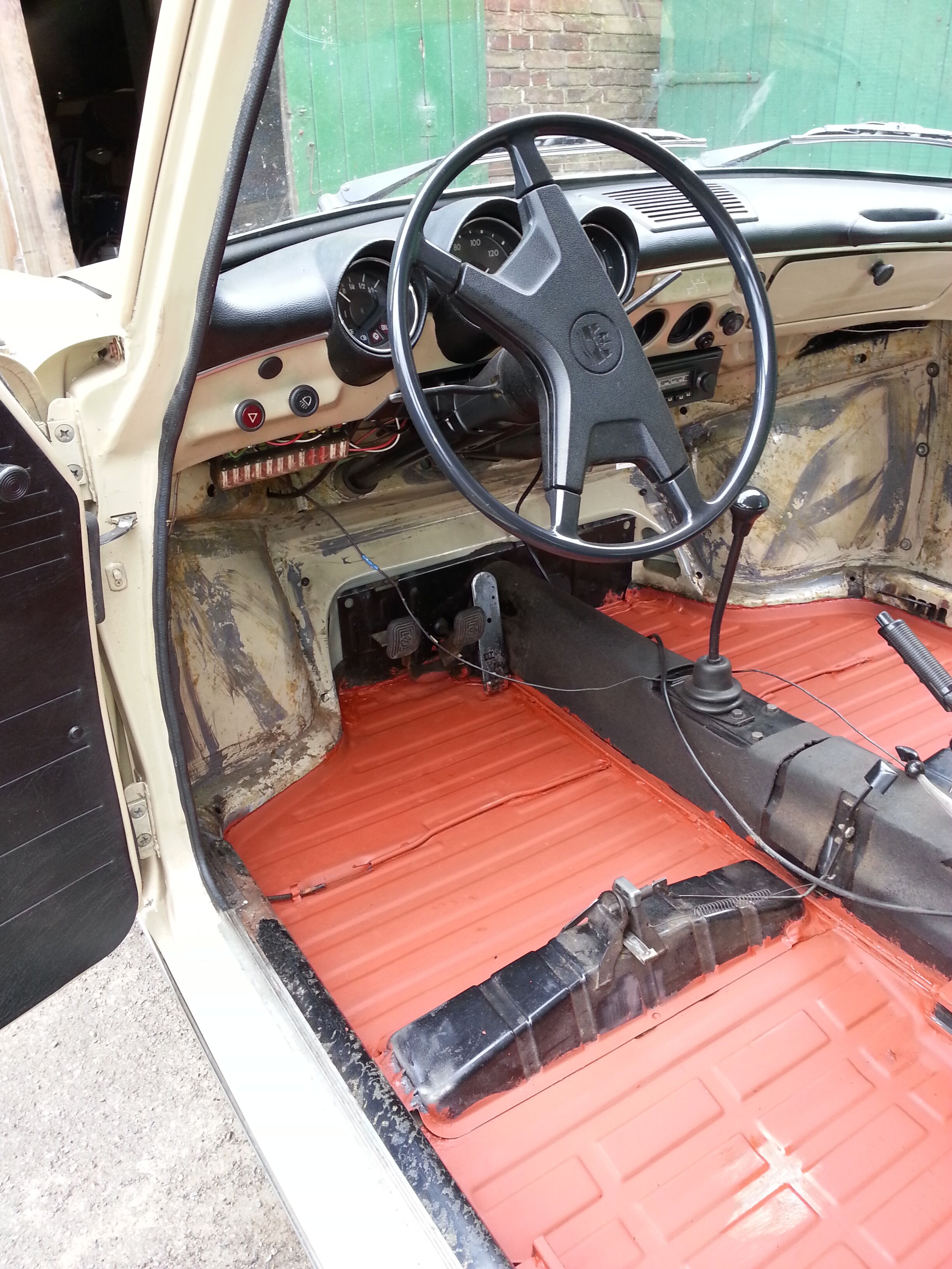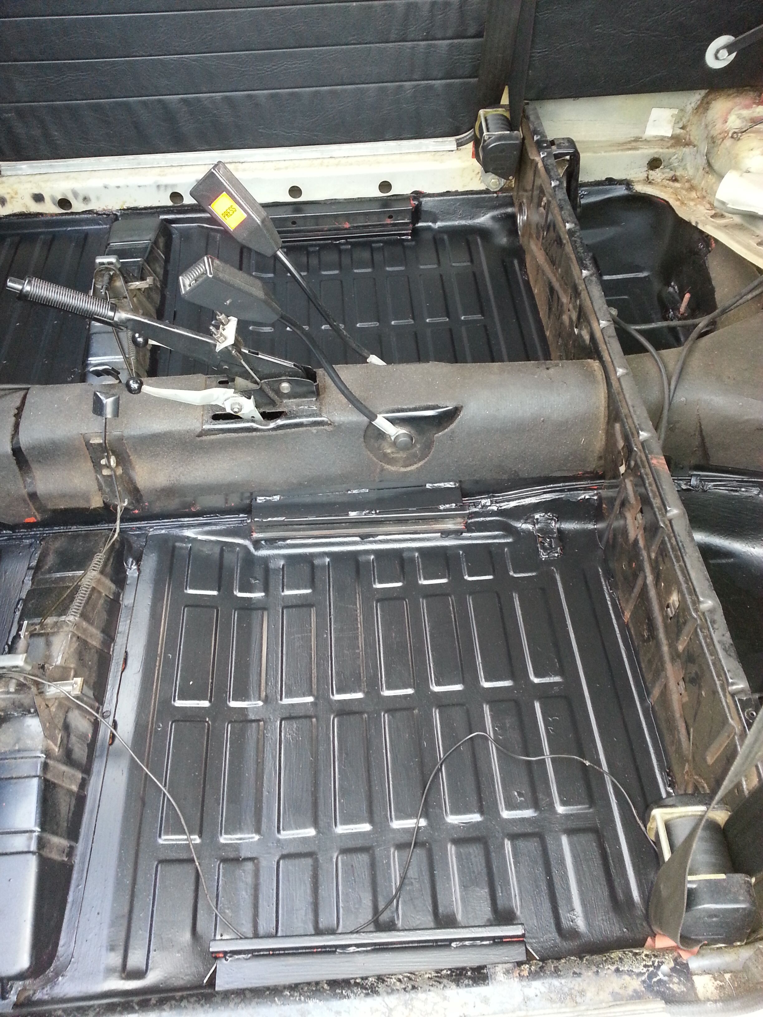 Tag 3: Endlich konnte der finale Anstrich erfolgen. Die Farbe, schwarz seidenmatt, sah wirklich geil aus. Wie frisch aus dem Werk. Einziger kleiner Nachteil, wenn der Teppich drüber liegt, sieht man nichts mehr von der Bodenplatte. ;-) Aber gut, man kann nicht alles haben. Nun folgte der weitere Zusammenbau. Da die ursprüngliche Gummimatte nicht mehr zu retten war, wurde erstmal ein alter, noch vorhandener Teppich verlegt. Mal sehen wie die endgültige Teppichfrage geklärt wird. Ich bin mir da noch unschlüssig. Dann bauten wir noch die Sitze ein und Dolf war wieder trocken und fahrbereit.