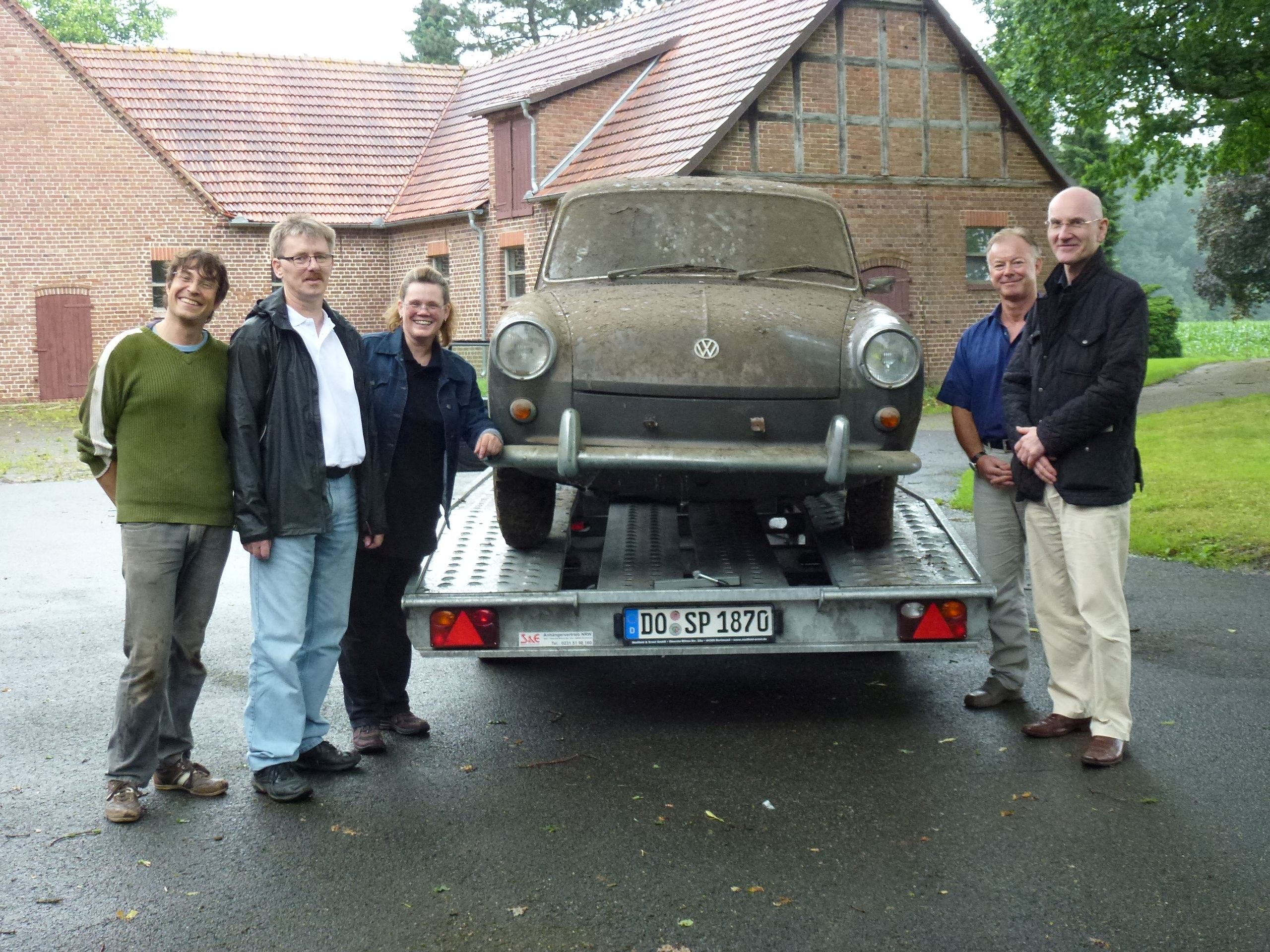 Einen Monat später fuhren wir dann mit Autoanhänger bewaffnet, in strömenden Regen, los um den Wagen abzuholen. Als tatkräftige Hilfe stand uns Jochen zur Seite, ohne den diese Bergung nicht möglich gewesen wäre. Nachdem wir den Wagen auf „Rollschuhe“ gestellt hatten, konnten wir ihn gut durch die Scheune manövrieren. Die Vorderreifen hatten sogar nach 27 Jahren noch Luft, einen Hinterreifen konnten wir aufpumpen, der Andere hatte einen Riss. Leider fehlte der Zündschlüssel und das Lenkradschloss war eingerastet. Aber am Ende musste er sich geschlagen geben.